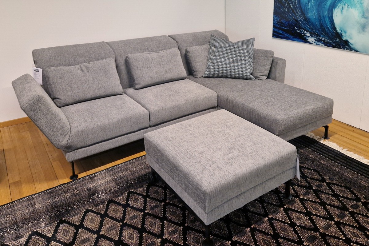 Bestehend aus Anbausofa links mit Drehsitz und Longchair rechts und Hocker.