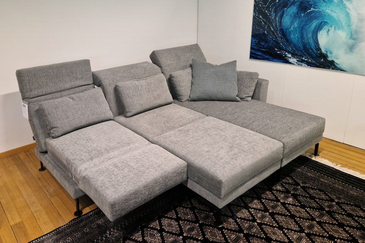 Polstergruppe mit Longchair rechts, Drehsitz links und Hocker mit einseitigen Rollen. Armlehne abklappen, nach vorne schwenken und schon gibt es einen zweiten Longchair. Stellt man den Hocker in die Lücke, ergibt sich eine Liegewiese. Die Polsterguppe MOULE von Brühl ist wandelbar. Alle Rückenlehnen verfügen über eine Relaxfunktion und variable Nackenstütze. Die verschiebbare Armlehne beim Longchair ermöglicht einen zusätzlichen Sitzplatz.