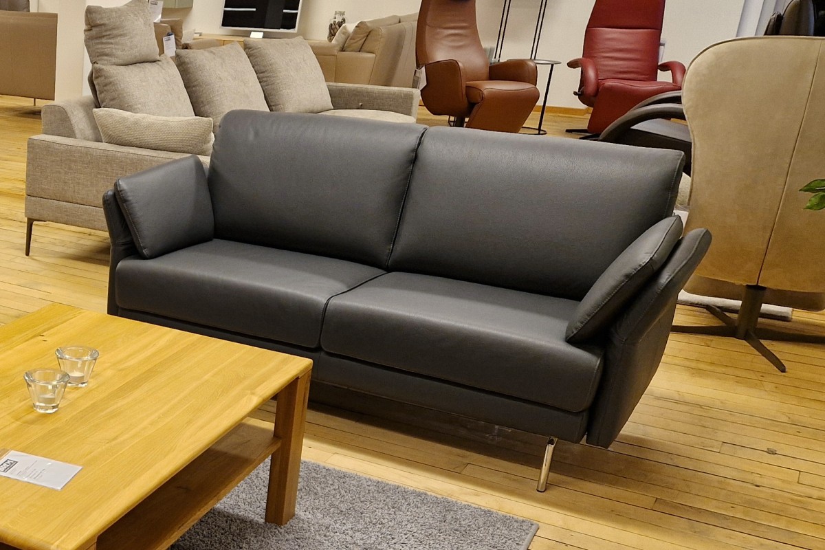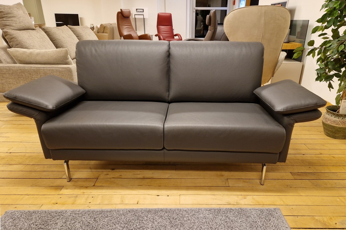 Klassisches Sofa vom Schweizer Hersteller Horst aus Steinen SZ. Kompaktes 2er-Sofa in Leder Elegance anthrazit, mit Füssen in chrom glanz. Das Sofa MELIDE verbindet klassisches Design mit bestem Sitzkomfort. Sitztiefe und Härte sind optimal für korrektes Sitzen abgestimmt, dies unterstützt auch ein einfaches Aufstehen. Die Armlehnen sind mit einem Rasterbeschlag klappbar.