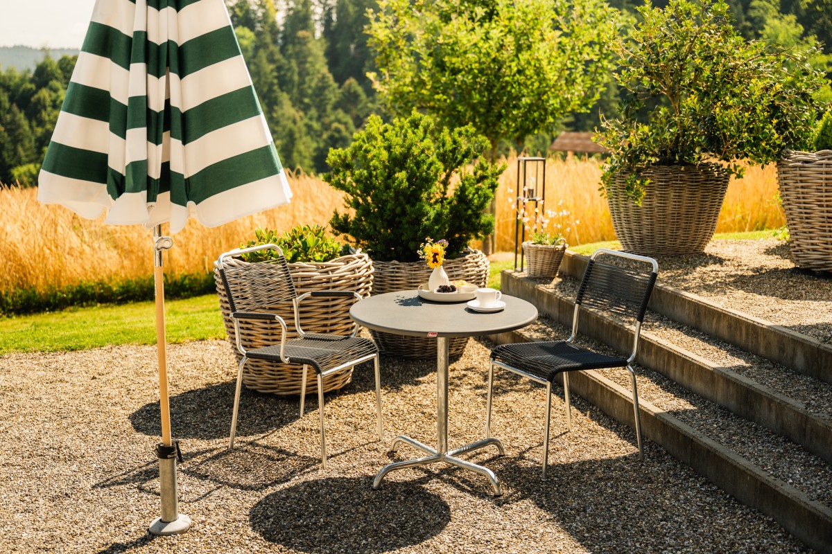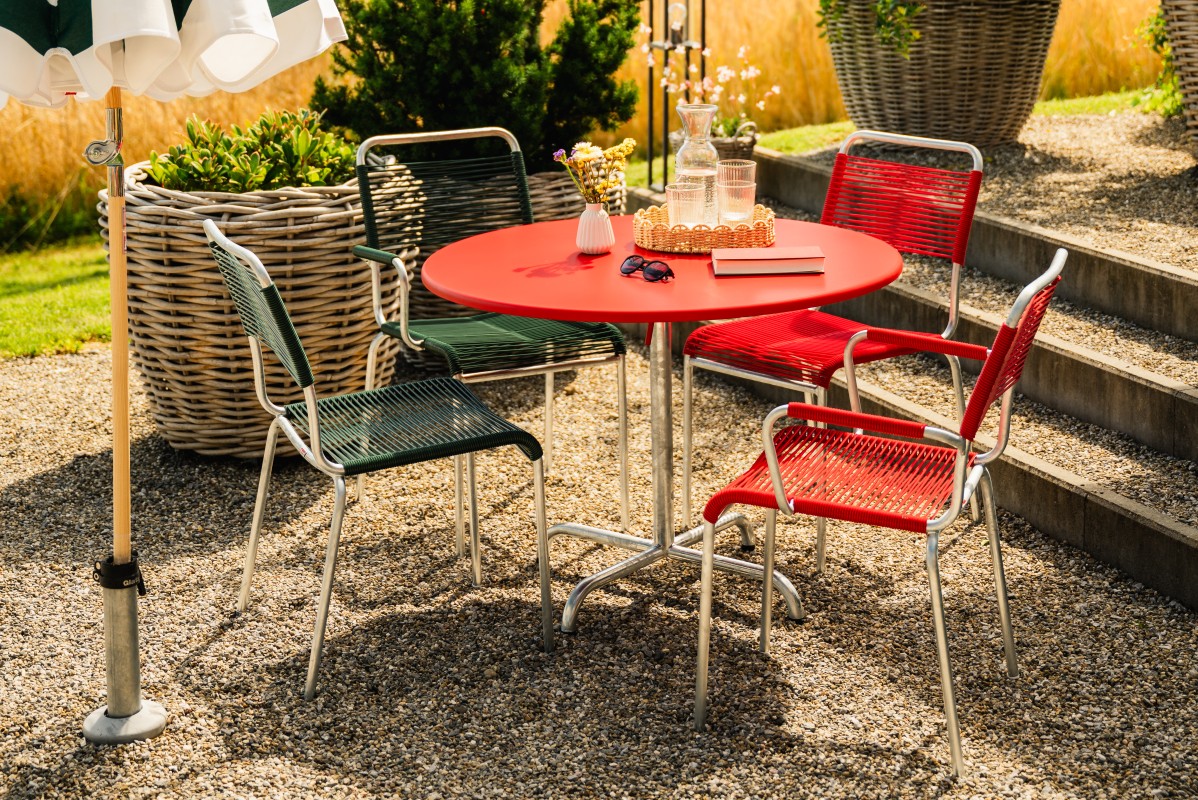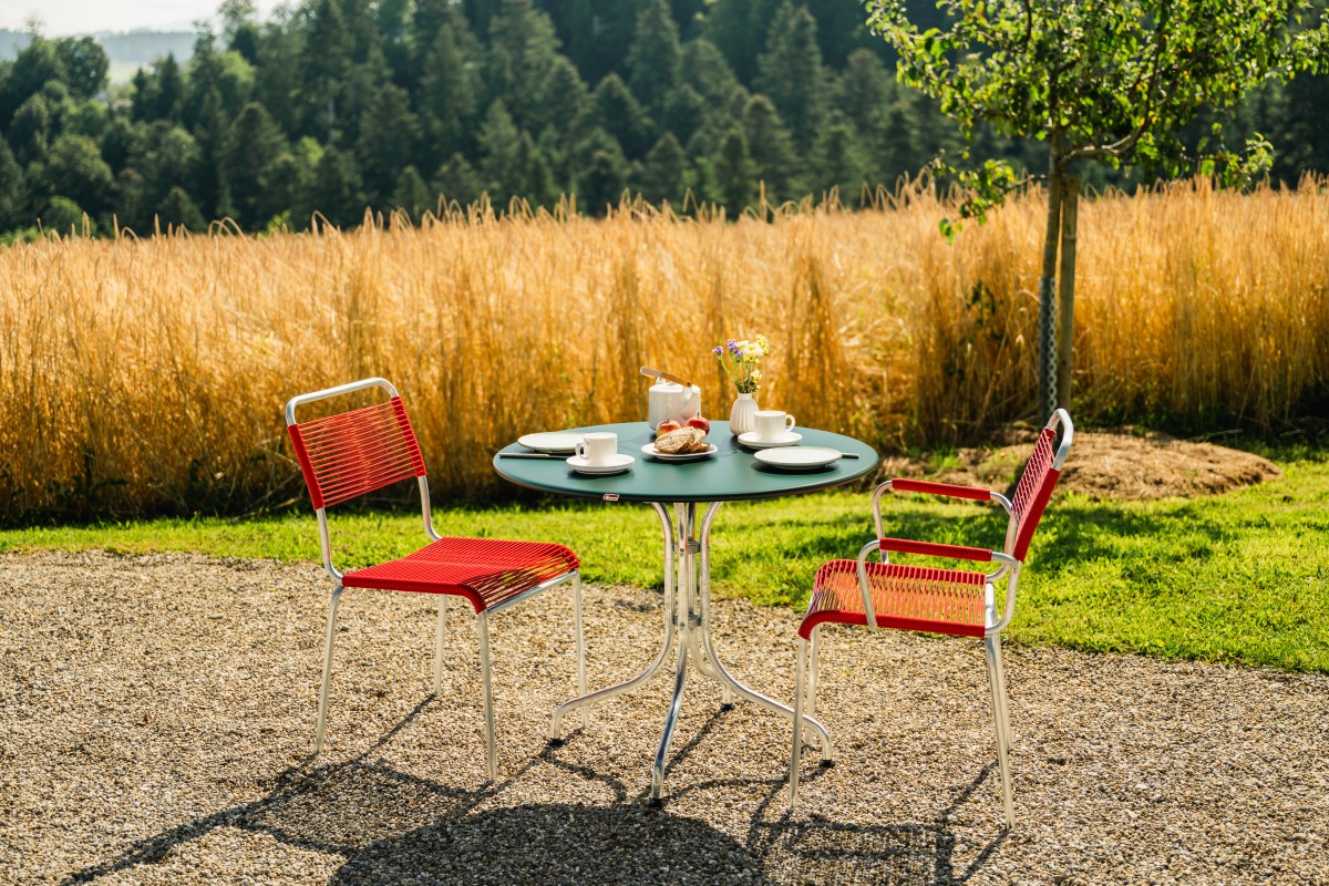 Angenehm weiche Sitzfläche aus der bewährten Spaghetti-Bespannung. Typisch für den Spaghettistuhl RIGI ist das feuerverzinkte Stahlrohrgestell. Auf Wunsch aber auch mit reiner Polyesterpulver-Beschichtung erhältlich. Die Stühle sind wahlweise mit oder ohne Armlehne erhältlich und stapelbar. SWISS MADE.