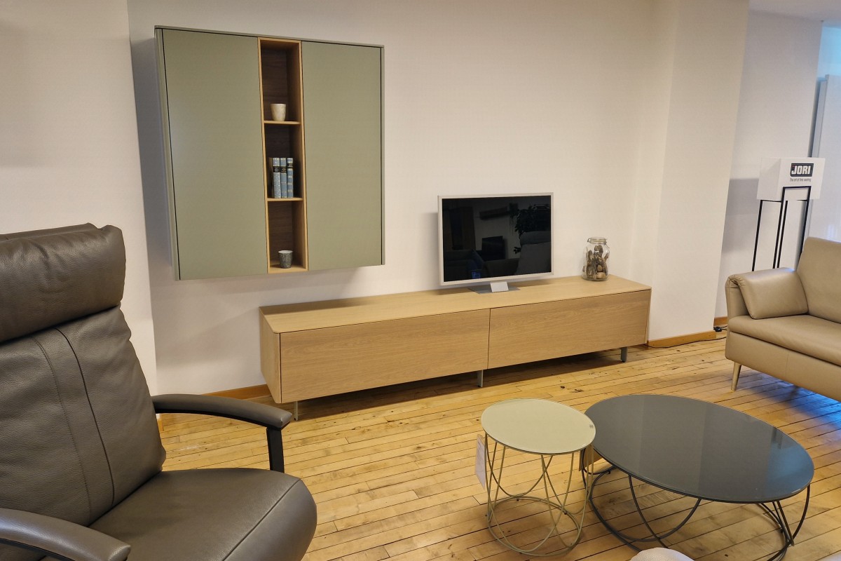 Hängeschrank in Lack Farbe salbei und offenem Regal in Eiche hell