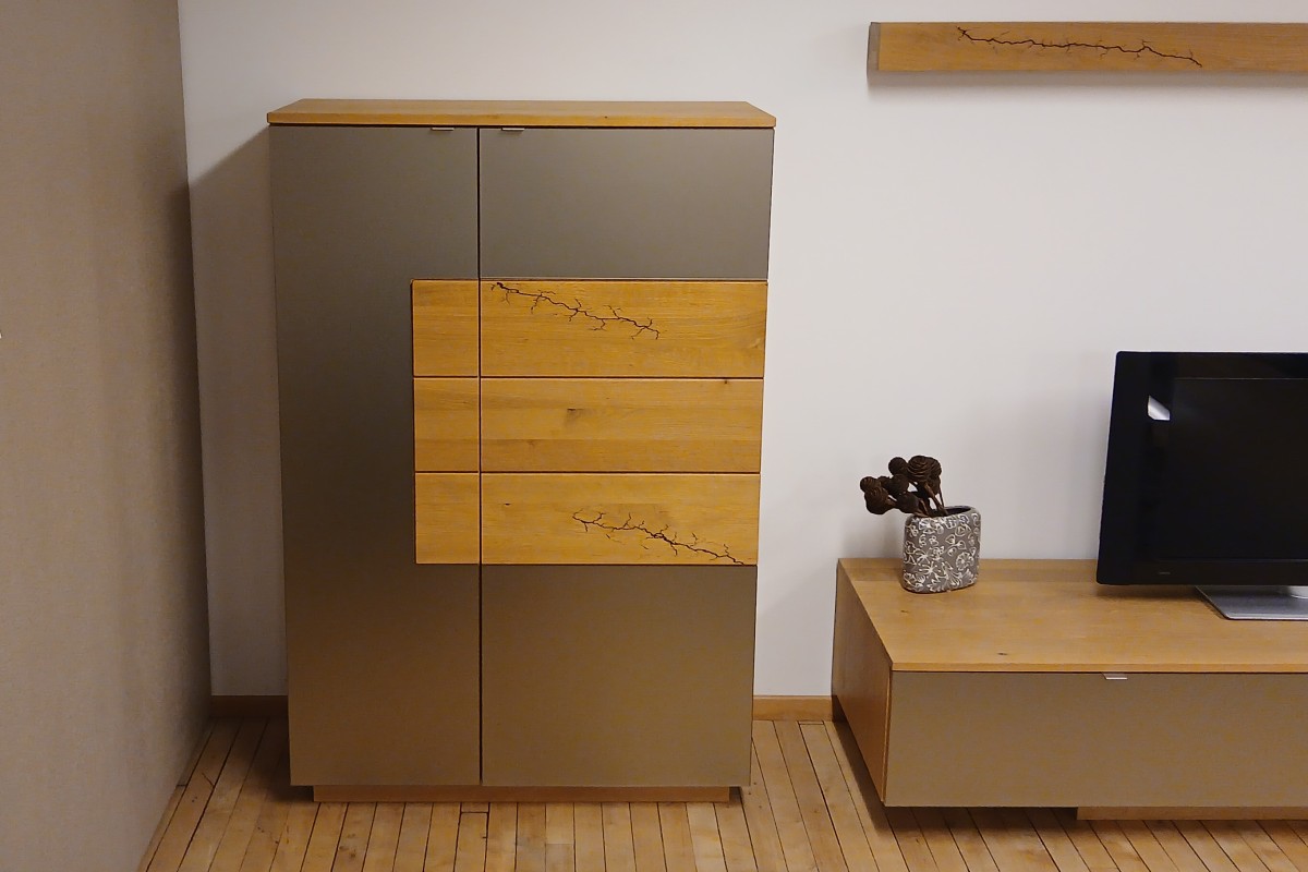 Stilvolle Details wie feine Ornamente im massiven Holz sowie Fronten aus satiniertem Glas fügen sich zu einem harmonischen Ganzen zusammen.