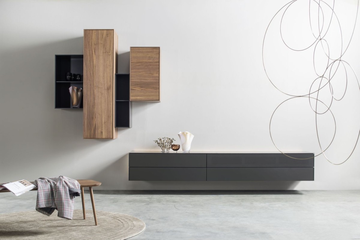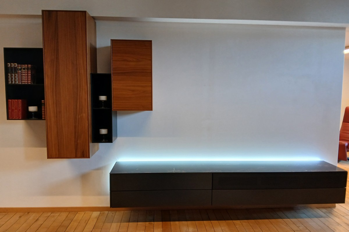 Lowboard in Kombination mit Hängeregalen und -korpussen in Lack cosmos-schwarz und Nussbaum natur Mix aus zwei Korpusbauweisen: Fronten vorschlagend und einschlagend.